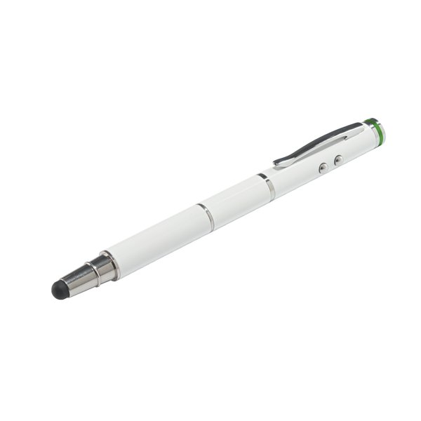 Penna Stylus multifunzione. Penna capacitiva per touchscreen, penna a sfera, puntatore laser e luce a LED. 1 penna stylus, 4 funzioni. Penna stylus capacitiva per dispositivi touchscreen che può anche essere utilizzata come penna a sfera, puntatore laser e torcia tascabile a LED. Completa i tuoi dispositivi mobili.Consente di utilizzare i touchscreen in modo preciso il display touchscreen dei tuoi dispositiviProtegge lo schermo del tablet dalle impronte e dalla polvereLa punta in morbido silicone protegge il display touchscreen da graffi e segniPenna a sfera di alta qualità (refill D1, lunghezza 67 mm)Puntatore laser integrato per le presentazioniTorcia tascabile a LED integrataComprensiva di 3 batterie AAA